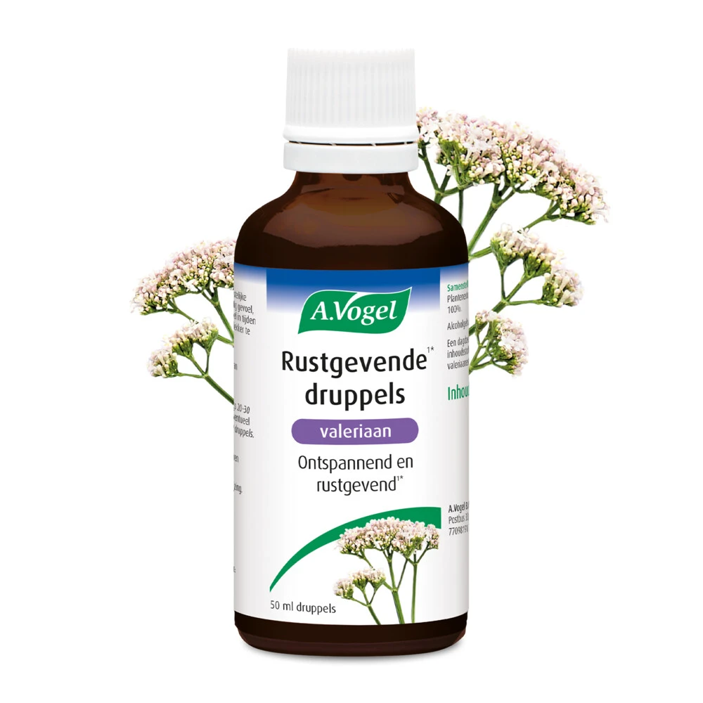 A.Vogel Valeriaan druppelsA.Vogel Valeriaan Ontspannend en Rustgevende1* druppels is een kruidenpraparaat op basis van Valeriaan. Valeriaan helpt bij geestelijke druk*, rusteloosheid*, gespannenheid* en zorgt voor evenwichtigheid tijdens spannende periodes*. Daarnaast helpt Valeriaan ook om lekker te kunnen slapen*.1 Valeriaan*Gezondheidsclaims in afwachting van Europese toelating.