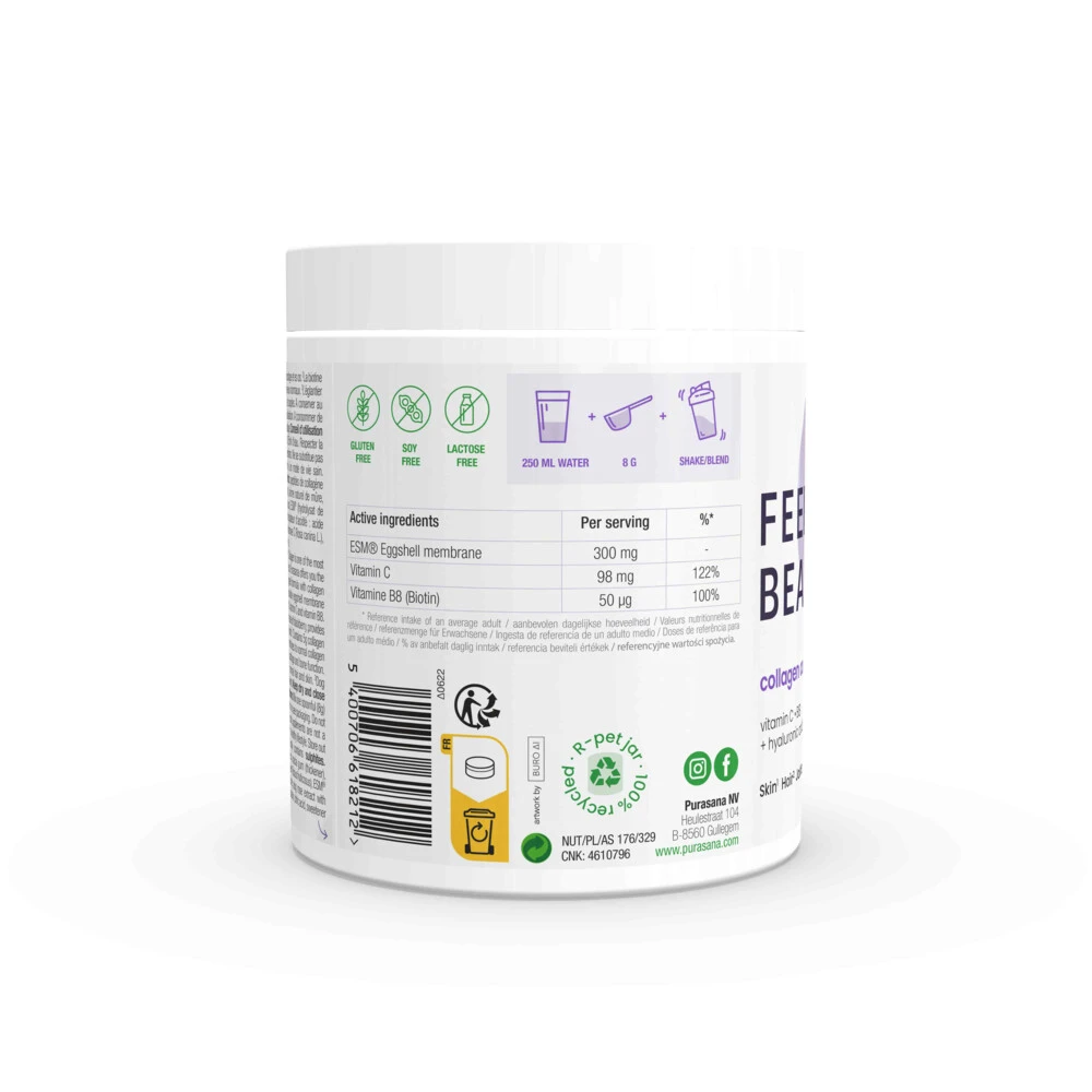Purasana Collageen Zwarte Bes Huid, Haar en NagelsPurasana Collageen Zwarte Bes Huid, Haar en Nagels is een voedingssupplement bestaande uit een zorgvuldig samengestelde formule met collageen peptiden afkomstig van runderen, ESM (oplosbaar eiermembraanhydrolysaat met 35% collageen en 2% hyalonzuur), vitamine C en vitamine B8. Deze bijzondere samenstelling biedt ondersteuning voor huid, haar en gewrichten*. Collageen is een van de meest essentiële, structuele eiwitten die het lichaam nodig h