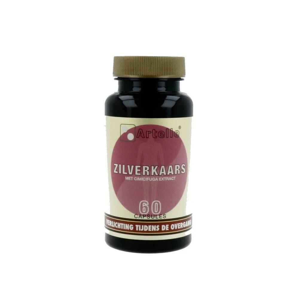 Artelle Zilverkaars Extract*Bij opvliegers*Bij overgangverschijnselen*Prikkelbare gevoelens*Wisselende stemmingen tijdens overgang*Sterkt aan tijdens menopauzeIngrediëntenZilverkaars extract (5:1)(cimicifuga racemosa)micro crystalline cellulose, tricalcium fosfaat, magnesium stearaat.capsulewand: water, gelatine.