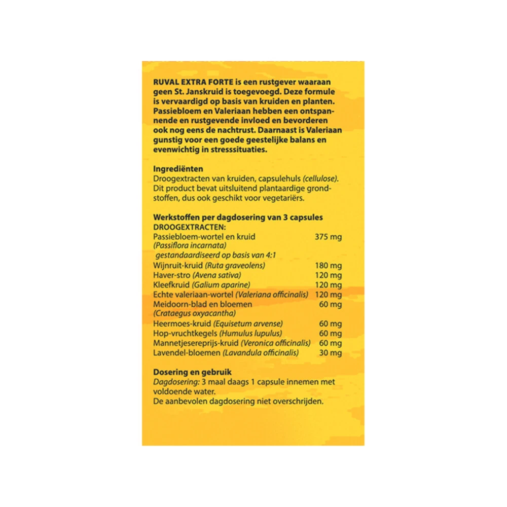 Ruval zonder St JanskruidRuval is gemaakt met een formule die vervaardigd is op basis van kruiden en planten, zonder gebruik te maken van st Janskruid. Ruval bevat onder andere Passiebloem en Valeriaan. Passiebloem en Valeriaan zijn ontspannend en rustgevend***, bevorderen de nachtrust***, zijn gunstig voor een goede geestelijke balans*** en evenwichtig in stresssituaties***.Dit product bevat uitsluitend plantaardige grondstoffen, dus ook geschikt voor vegetariërs.Zijn ontspannend en rustge