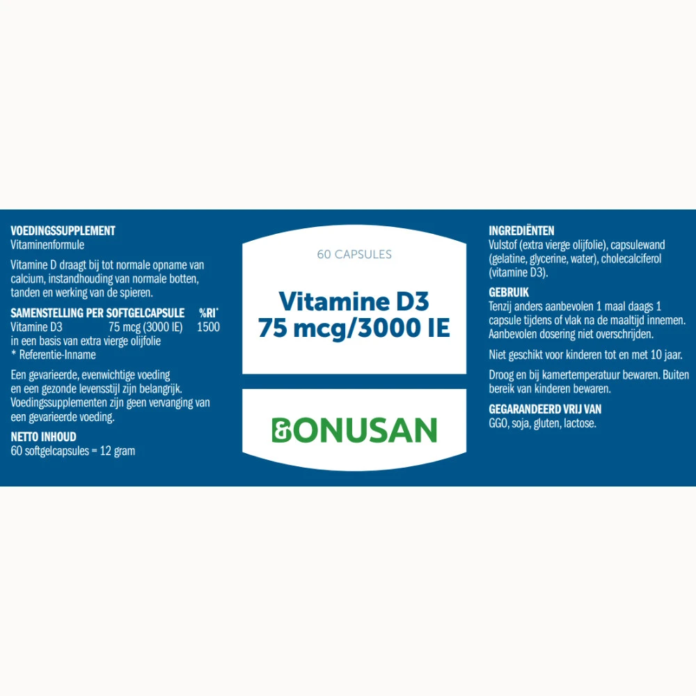 Bonusan Vitamine D3 75 mcg / 3000ieVitamine D vervult een essentiële rol bij het behoud van sterke botten en tanden. Het verhoogt de opname van kalk in de botten en draagt bij aan normale calciumwaarden in het bloed. Daarnaast heeft het een positieve invloed op het immuunsysteem, het proces van celvernieuwing en zorgt het voor sterkere spieren en meer spierkracht. Bonusan Vitamine D3 75 mcg / 3000 IE zijn dankzij de kleine, gemakkelijk slikbare capsules gemakkelijk te doseren.Hoge dosering