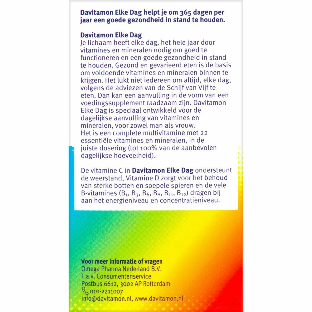 Davitamon Elke DagJe lichaam heeft elke dag, het hele jaar door, vitamines en mineralen nodig om goed te blijven functioneren en een goede gezondheid in stand te houden (zoals vitamine D en ijzer voor de weerstand). Gezond en gevarieerd eten is daarom belangrijk. Helaas lukt het niet iedereen om elke dag volgens de adviezen van de Schijf van Vijf te eten. Aanvulling in de vorm van een voedingssupplement kan dan raadzaam zijn. Davitamon Elke Dag is speciaal ontwikkeld voor die dagelijkse aanvulli
