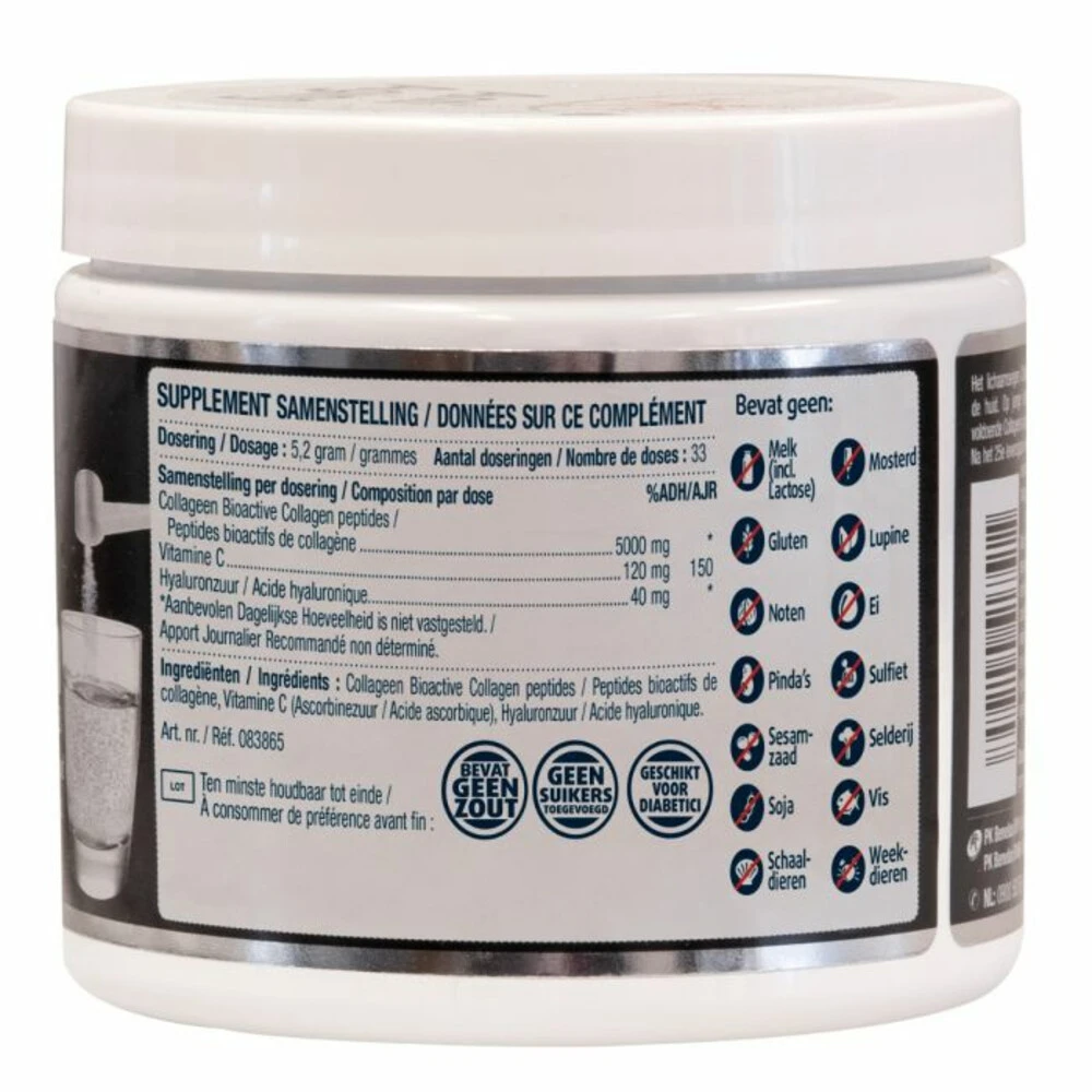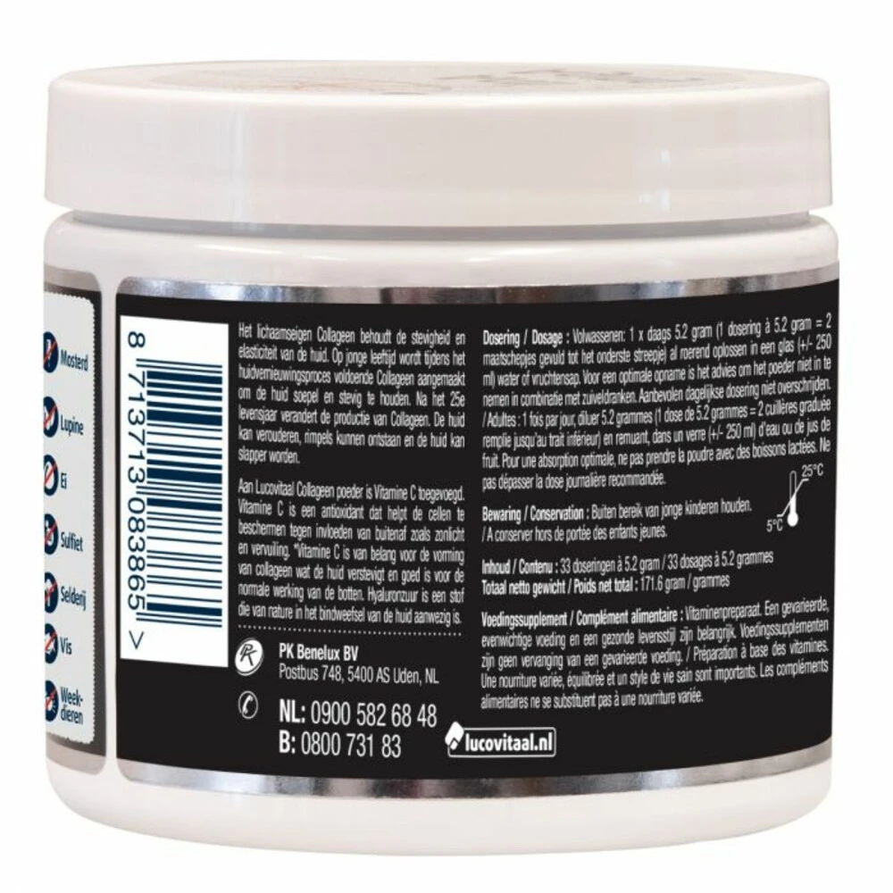 Lucovitaal Collageen Super 5000mg Poeder Het lichaamseigen Collageen behoudt de stevigheid en elasticiteit van de huid. Aan Lucovitaal Collageen poeder is Vitamine C toegevoegd. Vitamine C is een antioxidant dat helpt de cellen te beschermen tegen invloeden van buitenaf zoals zonlicht en vervuiling. Vitamine C is van belang voor de vorming van collageen wat de huid verstevigt en goed is voor de normale werking van de botten*. Hyaluronzuur is een stof die van nature in het bindweefsel van de