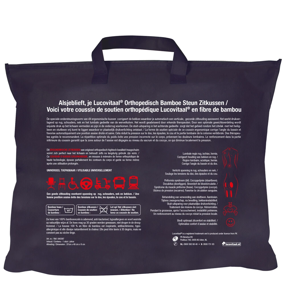 Lucovitaal Bamboe Steun Zitkussen 1 stukDit Lucovitaal Bamboe Steun Zitkussen is een speciale ondersteuningsvorm die de bekken corrigeert, waardoor je automatisch een verticale, gezonde zithouding aanneemt. Het werkt drukverlagend op rug, schouders, nek en het lumbale gedeelte van de wervelkolom. Door een optimale gewichtsverdeling wordt onjuiste druk op het lichaam vermeden en pijn in de onderrug voorkomen. Het Lucovitaal Bamboe Steun Zitkussen bevat een stuit-uitsparing in het achterste