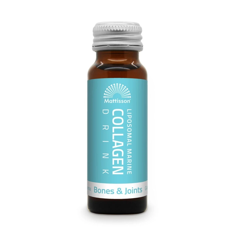 Mattisson Collageen Drink Bonen & JointsLiposomaal Marine Collageen Drink Bonen & Joints is rijk aan Vitamine Vitamine C en D3. Verder bevat Marine Collageen Drink Bonen & Joints Callogeen, Glucosamine, Bromelaïne, MSM en Kurkuma. Collageen is een belangrijk eiwit voor de bindweefsels. Vitamine C draagt bij aan een normale werking van botten en kraakbeen en Vitamine D houdt normale botten instand en zorgt voor een normale opname/gebruik van calcium en fosfor.Mattisson Collagen D
