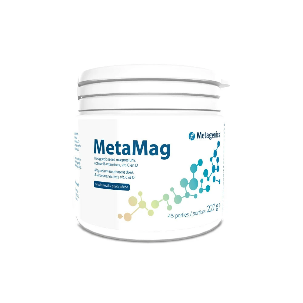 Metagenics Metamag PerzikMetagenics MetaMag Perzik is een voedingssupplement met extra hoge dosering magnesiumbisglycinaat- en glycerofosfaat. Deze vormen van magnesium worden zeer goed opgenomen en hebben een betere verdraagzaamheid dan andere magnesiumzouten. Daarnaast bevat het actieve B-vitamines, vitamine C en vitamine D.