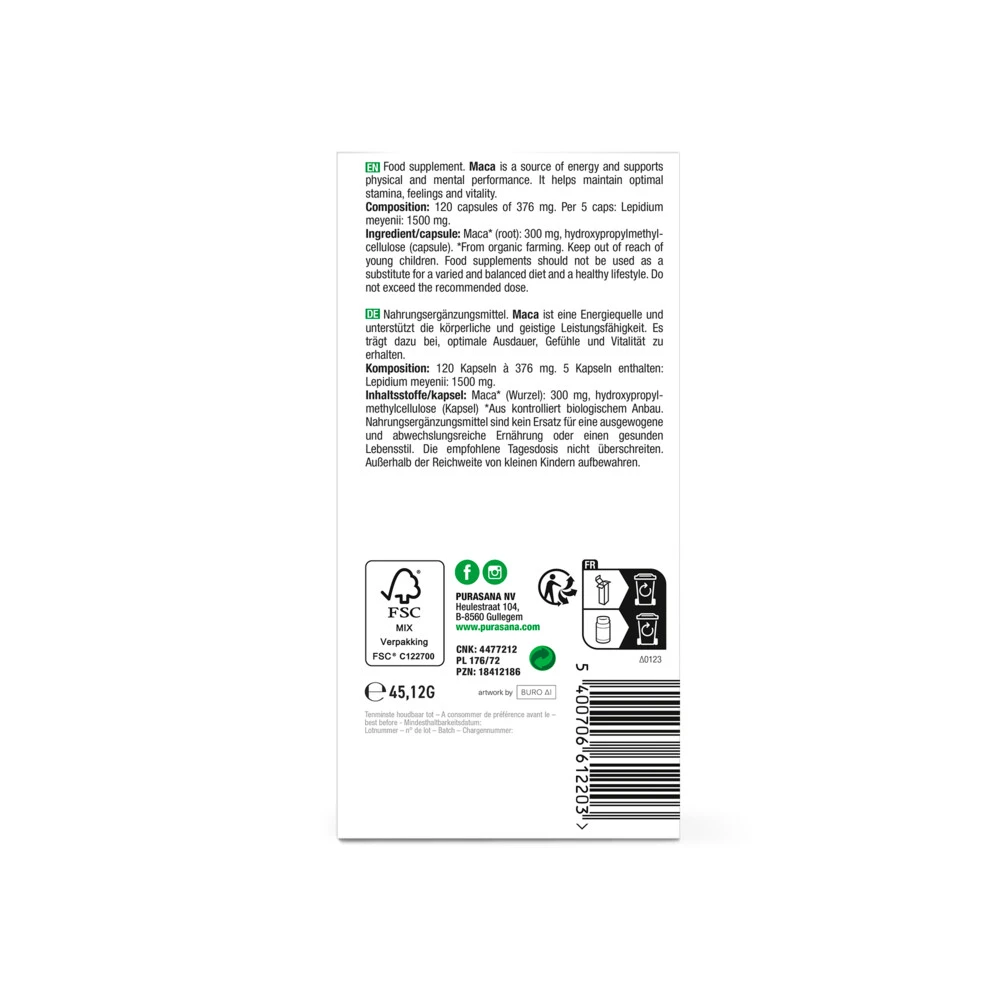 Purasana Maca Bio Maca is een knolgewas dat in het Andesgebergte (Peru) groeit. Het is een zeer sterk gewas dat op grote hoogte en onder extreme omstandigheden kan overleven. De voedingsstoffen die voor de mens interessant zijn, zitten vooral in de wortels van de plant. Deze worden al sinds jaar en dag door de plaatselijke bevolking gegeten.Maca biedt ondersteuning voor het libido en heeft een gunstige invloed op het cognitieve vermogen. Daarnaast bevat Maca van nature een hoog gehalte aan