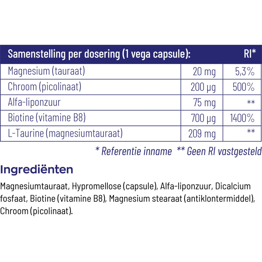Vitakruid Glycodin Vitakruid Glycodin is een complexformule die bestaat uit alfa-liponzuur, chroom picolinaat, biotine en magnesiumtauraat, een uitgebalanceerd kwartet voor de bloedsuikerspiegel. Complexformule Glycodin is speciaal ontwikkeld om de natuurlijke bloedsuiker te ondersteunen*. Uitgebalanceerd kwartet voor de bloedsuikerspiegelBiologisch beschikbaar magnesiumtauraatVersterkte werking door biotineLichaamseigen alfa-liponzuurVegacapsulesGlutenvrij en lactosevrijVegan*Chroom z