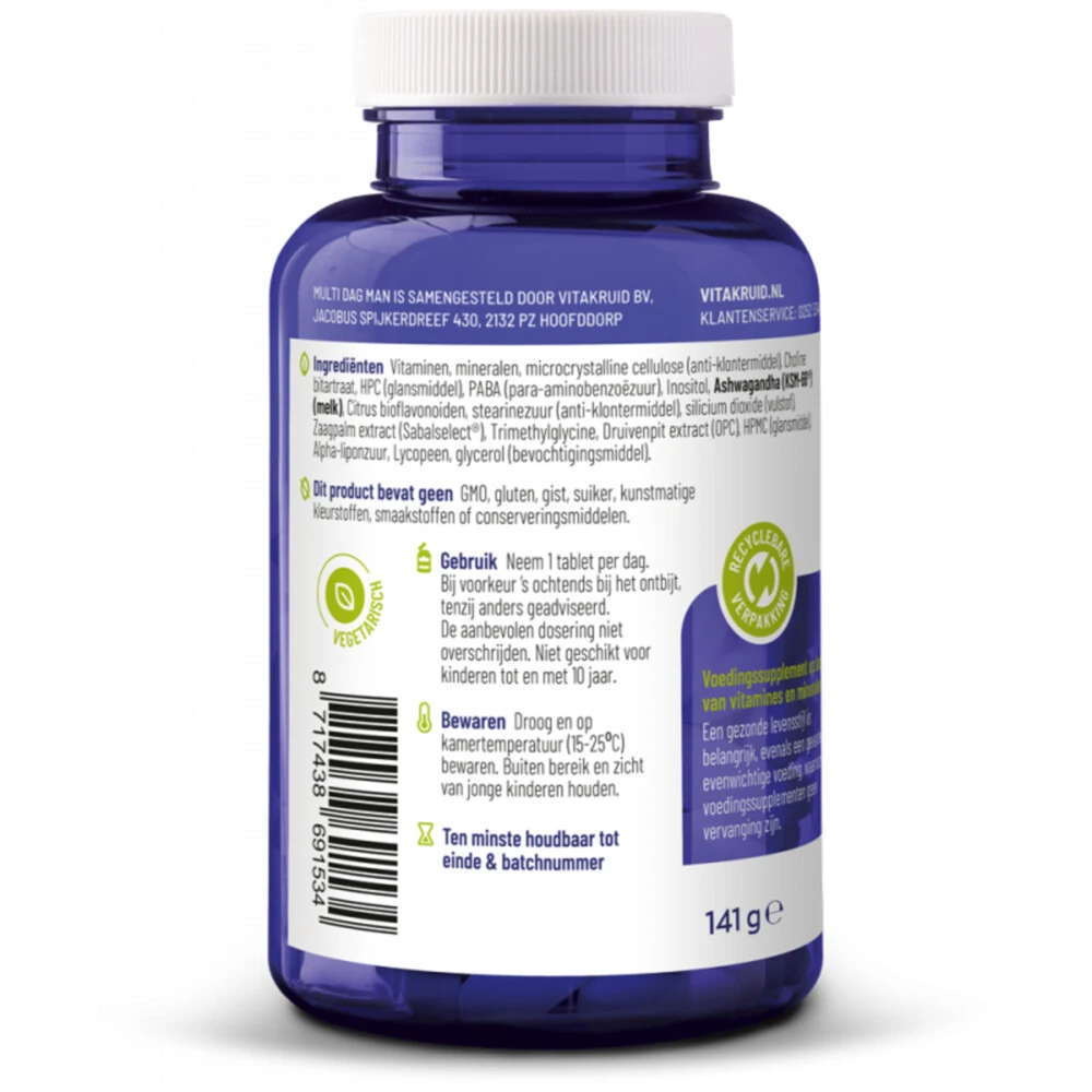 Vitakruid Multi Dag ManVitakruid Multi Dag Man bevat uitsluitend nutriënten met de hoogste biologische beschikbaarheid. Op deze manier ondervind je het meeste effect van het brede palet aan nutriënten. Multi Dag Man bevat alle B-vitaminen. Vitamine B is een natuurlijke energieleverancier. Naast B vitamines bevat Vitakruid Multi Dag Man ook Ashwagandha en Zaagpalm extract. Ashwagandha is een adaptogeen die het lichaam beter weerbaar maakt tegen stressvolle situaties**. Zaagpalm extract