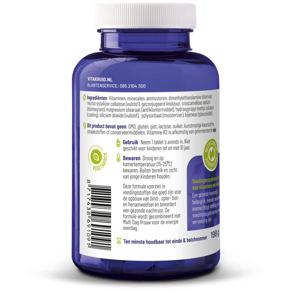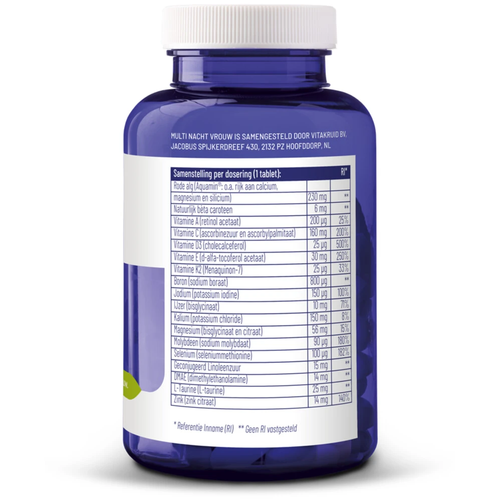 Vitakruid Multi Nacht VrouwVitakruid Multi Nacht Vrouw is een voedingssupplement op basis van vitamines en mineralen speciaal voor de vrouw. Wanneer de Vitakruid Multi Nacht Vrouw in combinatie met de Vitakruid Multi Dag Vrouw wordt gebruikt wordt ook rekening gehouden met het bioritme. Dit is de meest efficiënte en innovatieve toepassing van een Multi. ‘s Nachts heeft het lichaam meer behoefte aan de in vet oplosbare vitamines.Uitgekiende formule voor de nachtSynergetische werking do